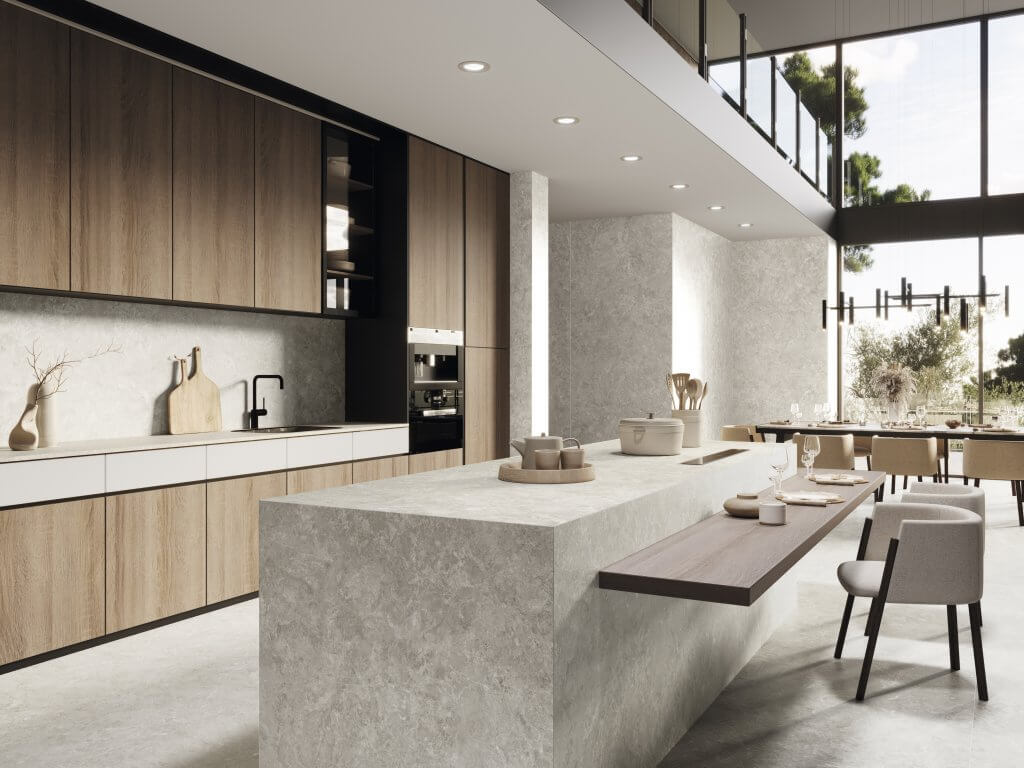 En este contexto, los cerámicos y porcelánicos desempeñan un papel fundamental gracias a sus propiedades no conductoras, que protegen los sistemas eléctricos sin comprometer la conectividad. Además, las innovaciones en diseño han permitido la integración de tecnologías avanzadas, como iluminación LED sensible a la presión y superficies con inducción integrada, logrando una fusión armoniosa entre funcionalidad vanguardia y estética sofisticada.