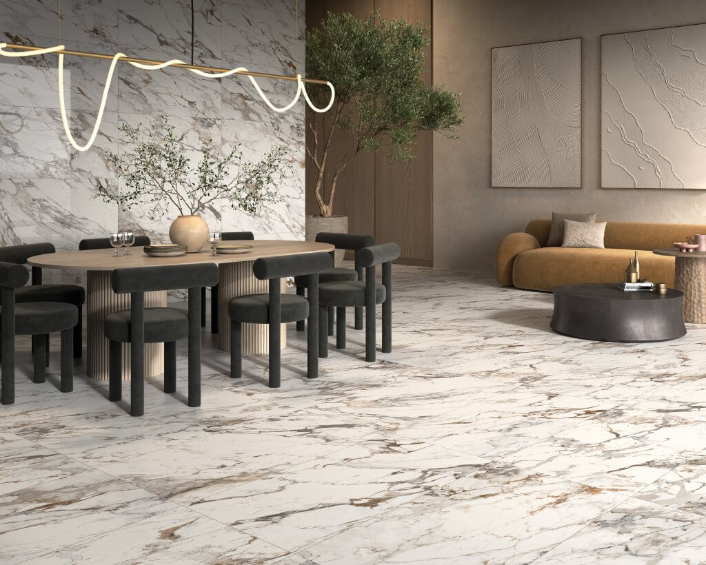 La elegancia de los cerámicos y porcelánicos con efecto mármol alcanza nueva e impresionante presencia con sutiles acentos dorados. La apariencia de la piedra, realzada por vetas doradas intensas, emana calidez y sofisticación, elevando la percepción de lujo en cualquier espacio.