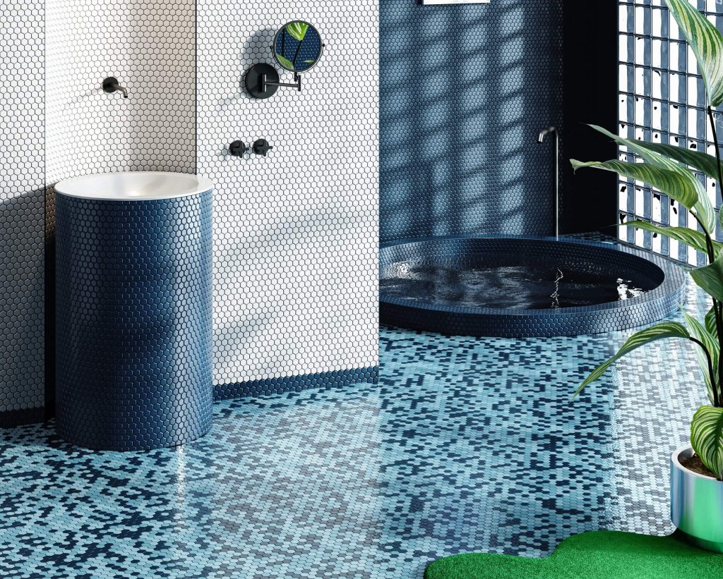 Los patrones, texturas y formas fluidas, evocadoras del movimiento de las olas, cobran vida a través de relieves tridimensionales, pinceladas artesanales, sofisticadas técnicas de esmaltado y efectos de sombreado únicos. Además, esta tendencia se extiende al mobiliario cerámico prefabricado, con piezas como lavabos y sanitarios en tonalidades azules, consolidando así una estética armoniosa y envolvente.